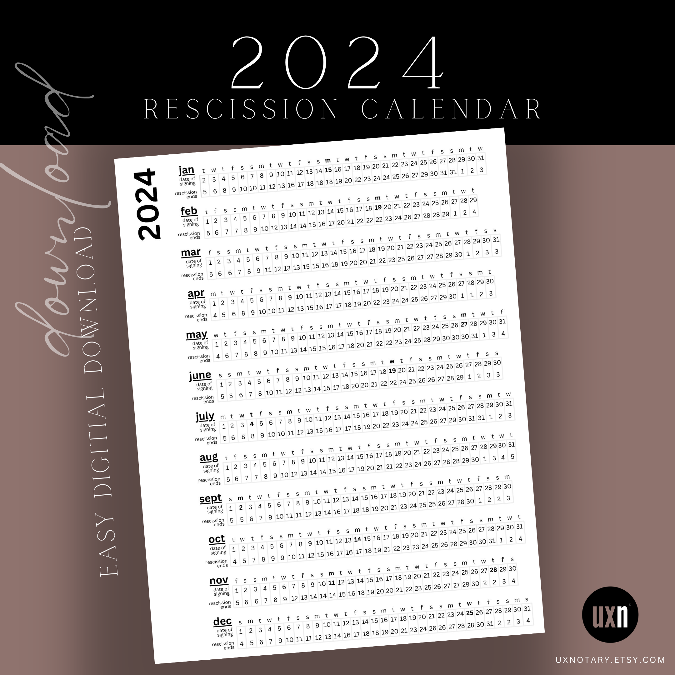 2024 DIGITAL RESCISSION CALENDAR Printable .pdf Bundle Loan Signing