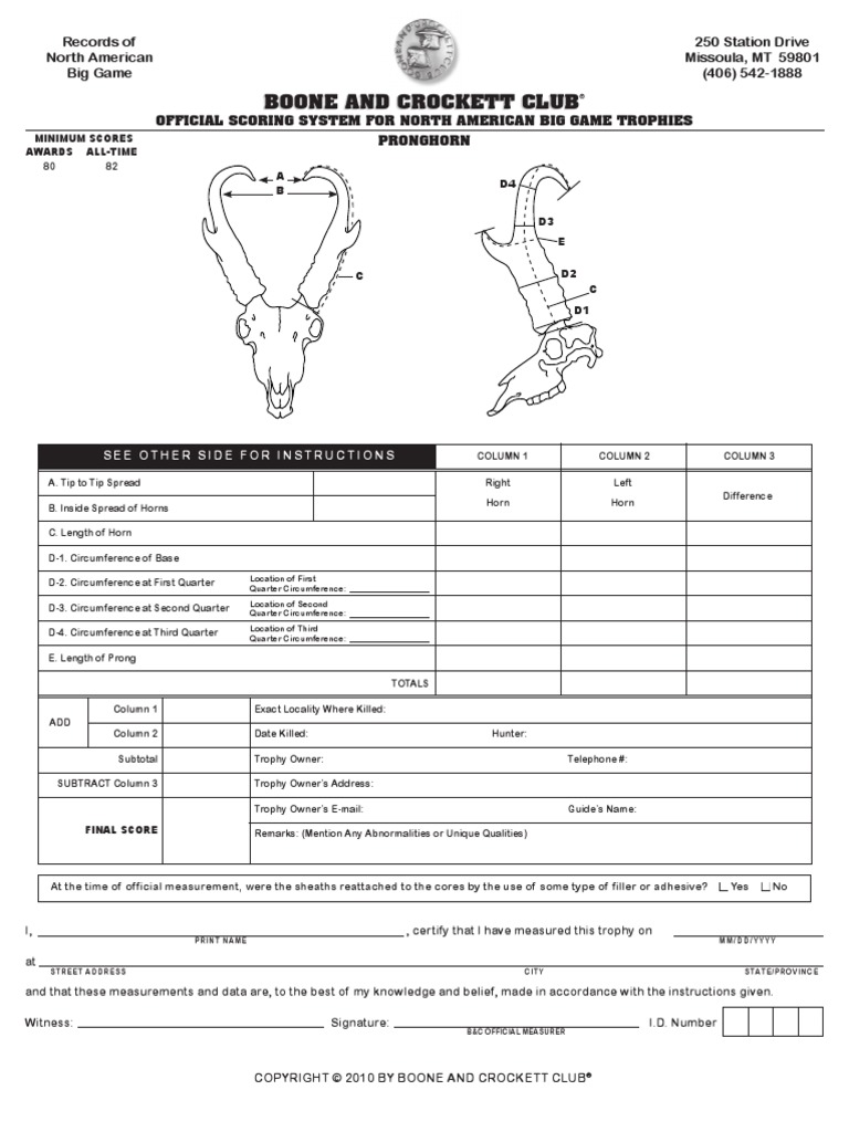 Boone and Crockett Pronghorn Score Sheet Big Game Hunting Hunting