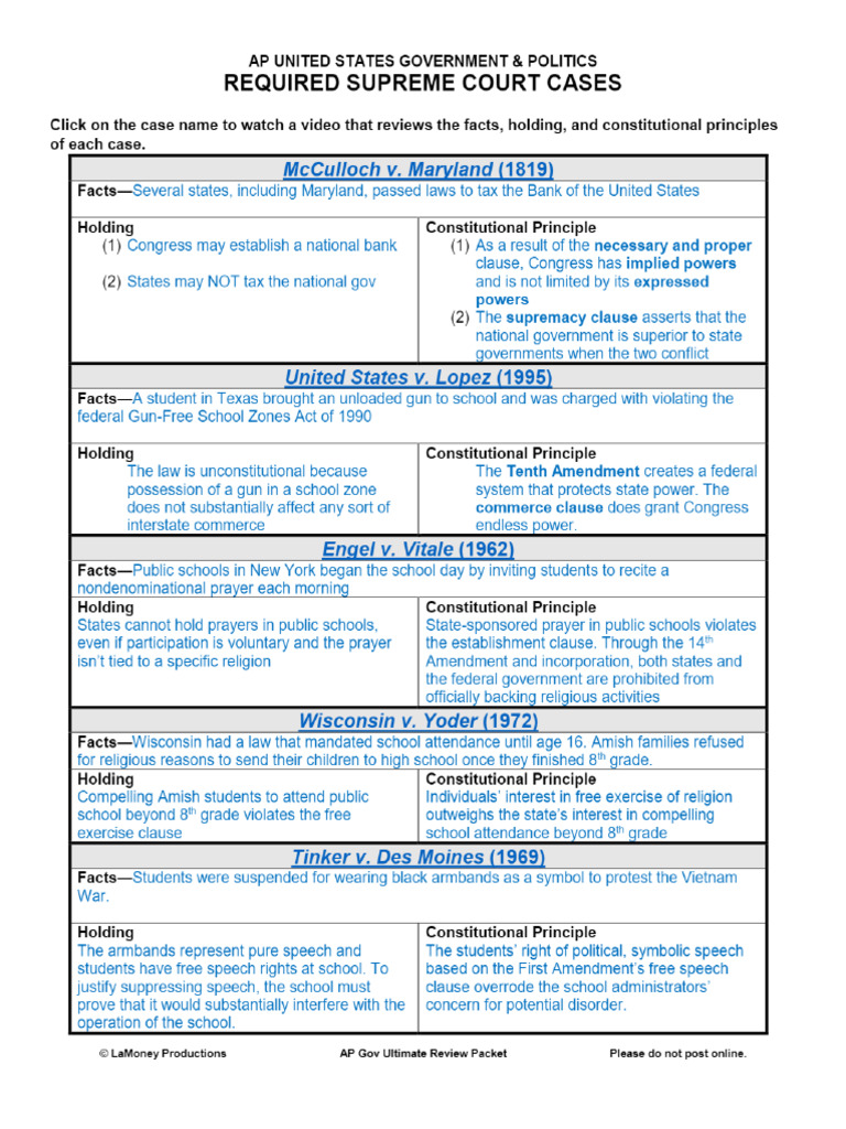 A review of the required cases for the 2021 ap government and politics test learn with. The courts ruled that the states cannot tax the federal government, i.e. • ap us government & politics students should be thoroughly familiar with 15 supreme court. The supreme court is allowed to nullify an act of the legislative or executive branch that violates. Congress shall have power to make laws with.