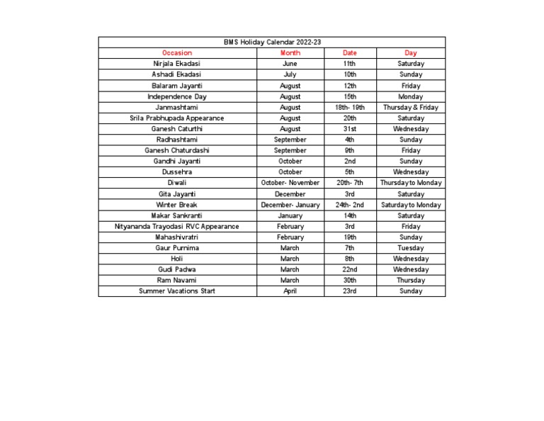 BMS Holiday Calendar 20222023 Sheet1 PDF